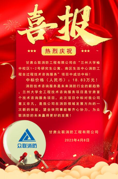 消防技术咨询服务是未来消防行业的新趋势兰州大学全工程技术咨询服务项目是甘肃首个技术咨询服务项目,此次项目中标对我公司意义非凡,是我公司在消防领域发展方向的一次新的体验,望全体同事能够齐心协力,为XK星空体育消防的未来赢得更好的发展!